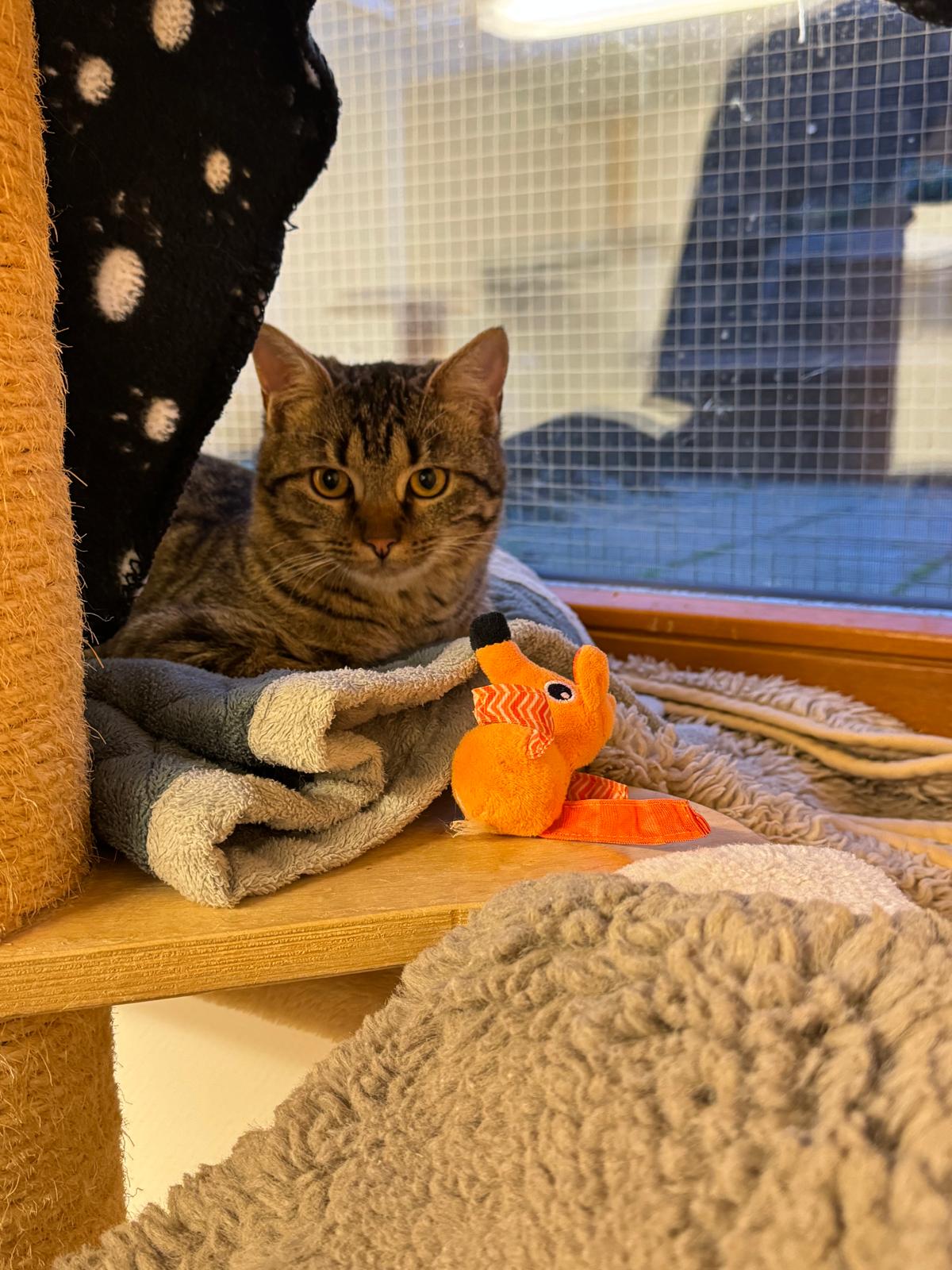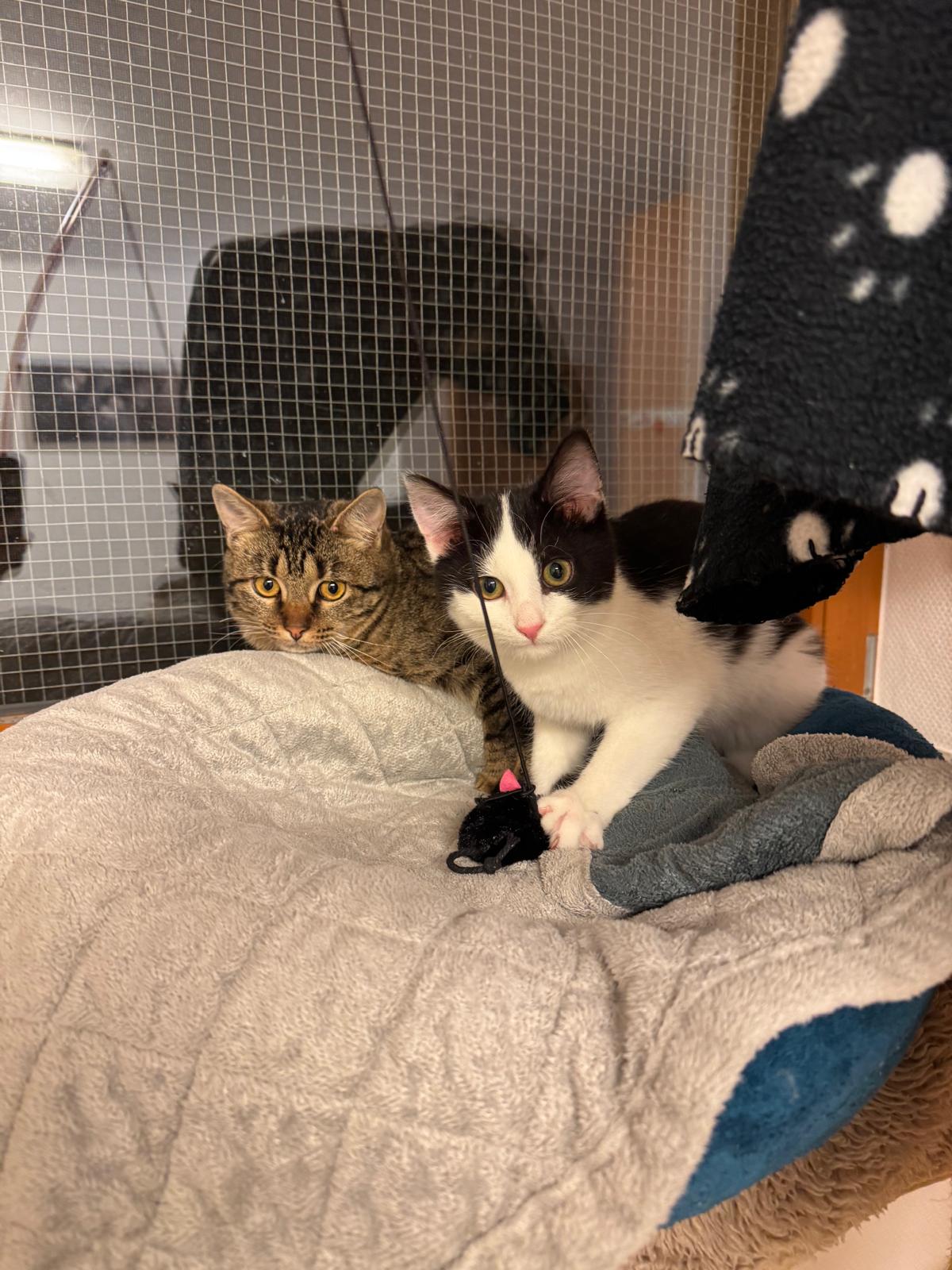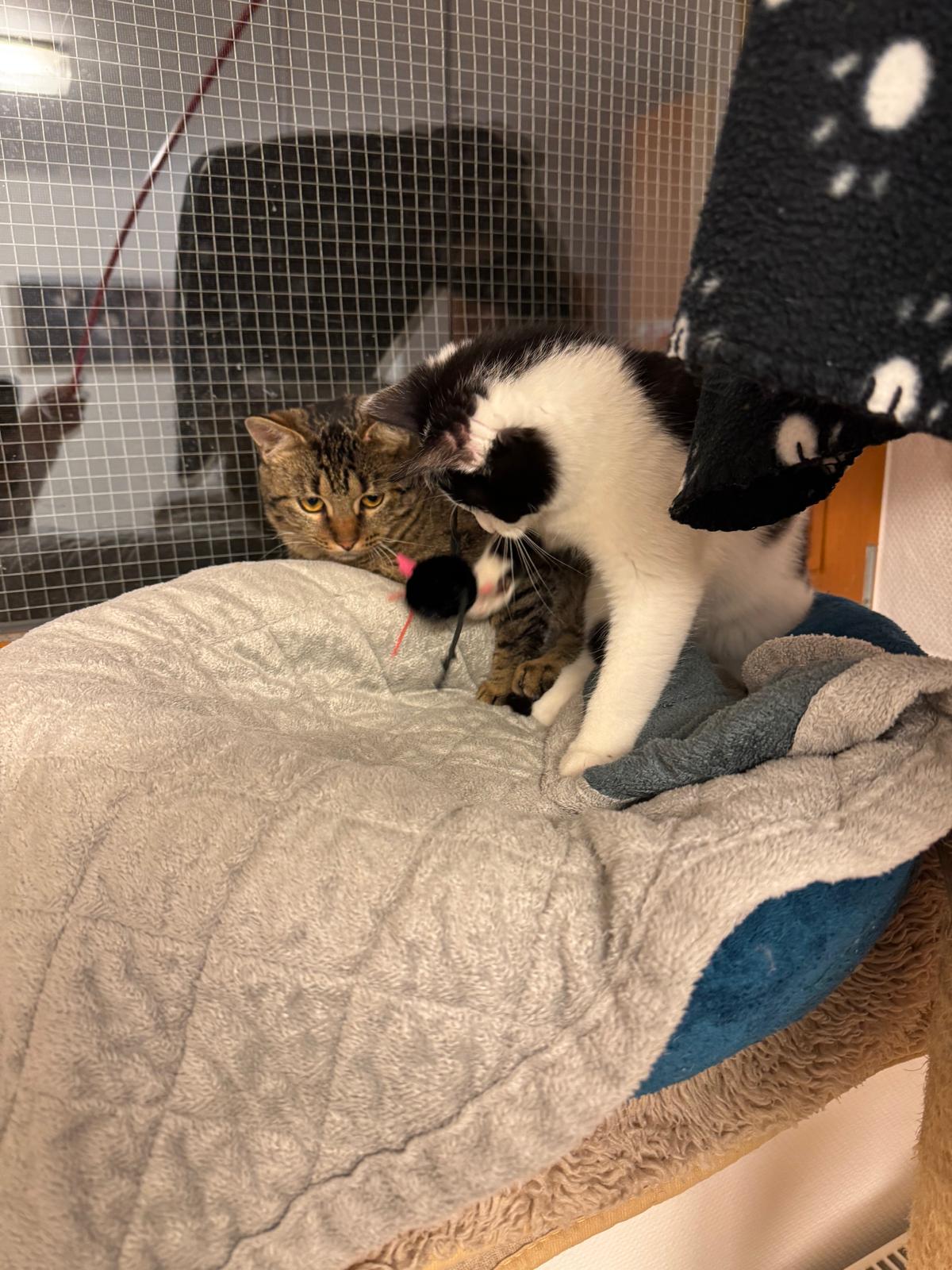 Pino ist gegenüber Menschen noch vorsichtig. Er lässt Nähe bereits zu, genießt erste Streicheleinheiten, braucht aber Zeit, Geduld und einen ruhigen Alltag. Lio hingegen sprüht vor Zuneigung, schnurrt viel, liebt Schmuseeinheiten und gibt diese Sicherheit ganz selbstverständlich an seinen Freund weiter. Zusammen sind sie ein eingespieltes Team: spielen, kuscheln, beobachten – und sich gegenseitig stärken.