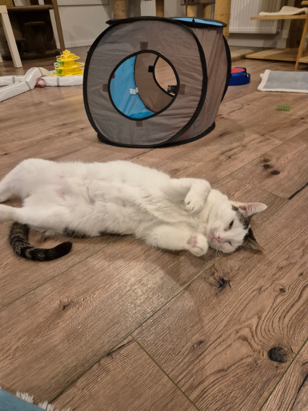 Nachdem ihre Kitten ausgezogen waren, blieb eine gewisse innere Anspannung bestehen. Püppi wurde kastriert, aufgrund von FORL mussten ihr alle Zähne gezogen werden, außerdem wurde das Eosinophile Granulom diagnostiziert. Für einen Neustart zog sie auf unsere Pflegestelle nach Gründau.